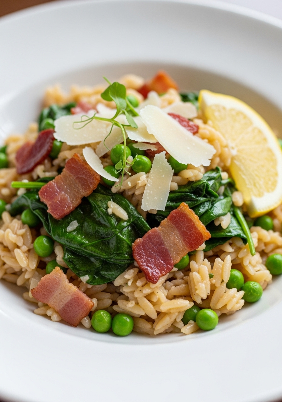 Discover the convenience of this delightful Orzo featuring crispy Bacon, tender Leeks, vibrant Peas, fresh Spinach, and a zesty hint of Lemon. This one-pot dish is not only simple to prepare but also promises to earn its spot as a staple in your weeknight dinner lineup!