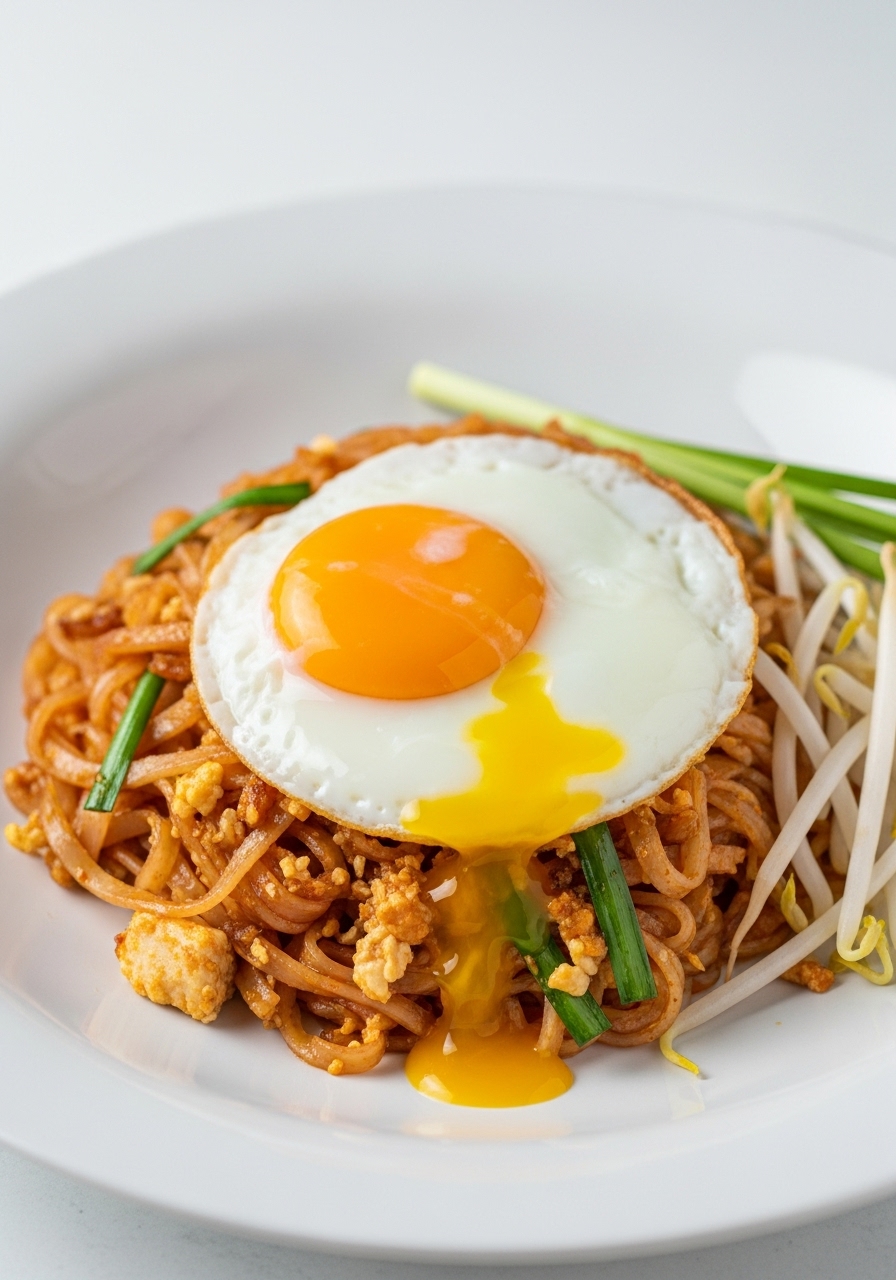Push the noodles to one side of the skillet using a spatula, then crack the eggs onto the vacant side. Break the yolks with the spatula and allow them to cook for approximately 30 seconds.