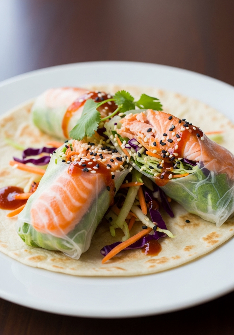 Crisp and golden on the exterior while remaining tender and succulent within, these gluten-free salmon spring rolls are expertly pan-seared for the ultimate flavor and texture experience.