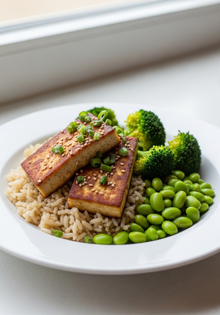 These quick and simple Pan Seared Tofu Bowls featuring Edamame Rice are loaded with protein and can be prepared in less than half an hour. They make for a tasty vegetarian option, ideal for lunch, dinner, or even meal prep!
