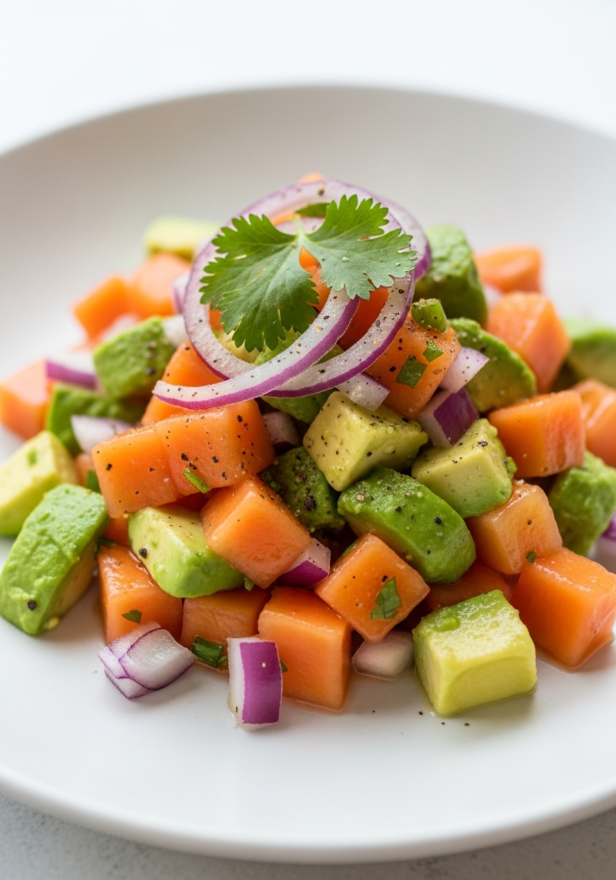 "With a delightful blend of papaya, creamy avocados, zesty lime juice, and fresh cilantro, this vibrant tropical salad transports your taste buds straight to the sun-soaked shores of the Caribbean."