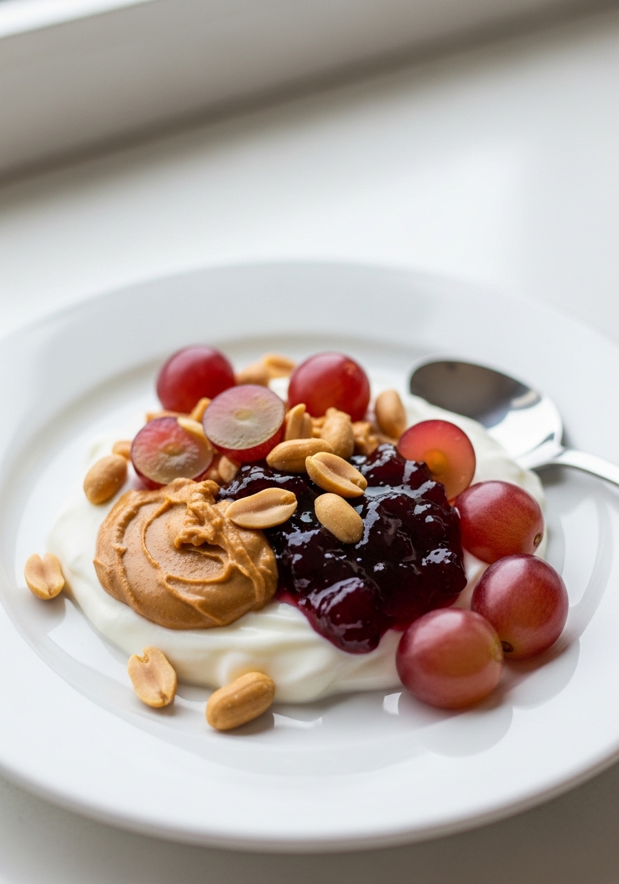 Creamy yogurt topped with peanut butter, sweet grape jam, crunchy peanuts, and juicy red grapes... who needs a slice of bread?