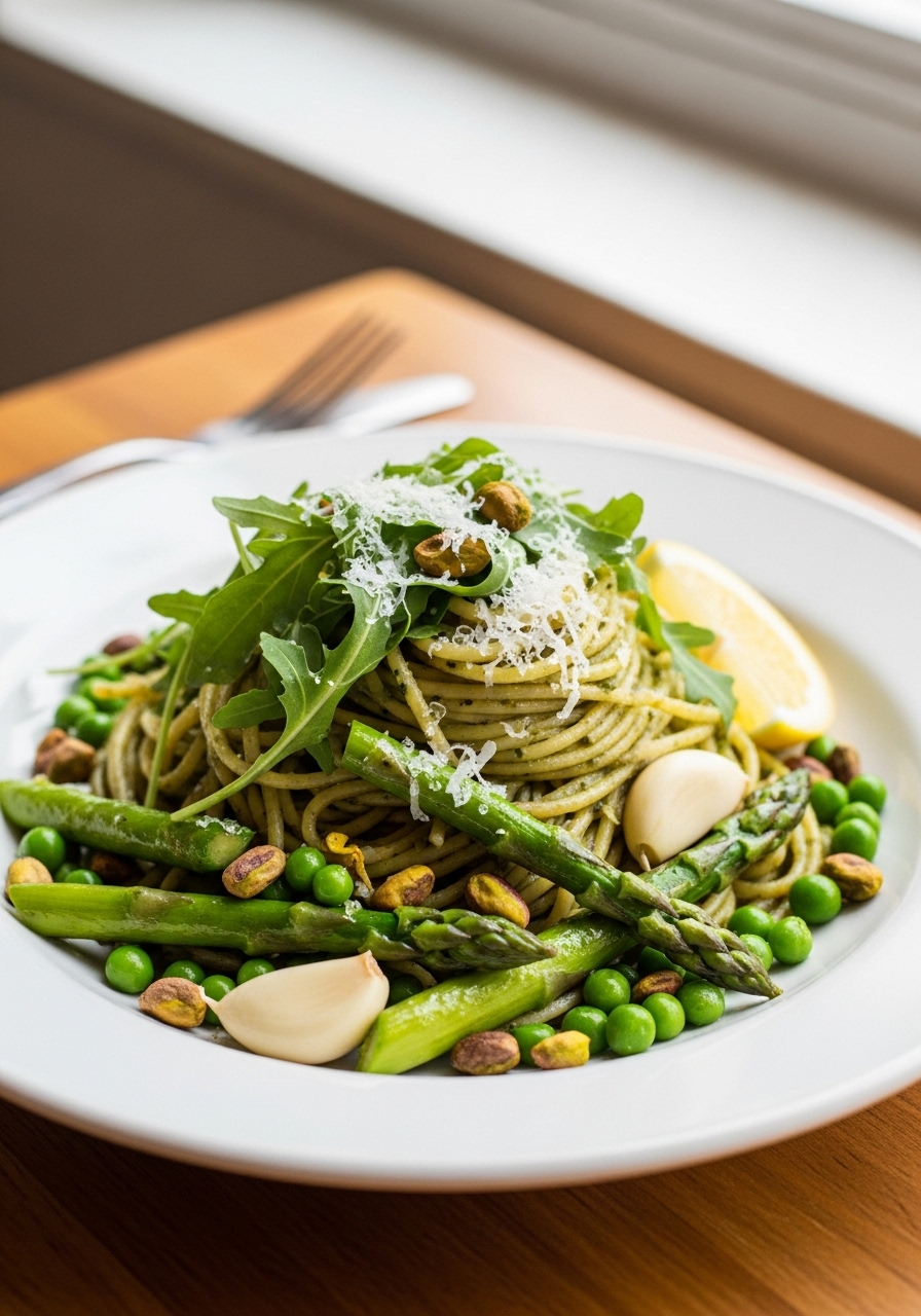 Indulge in this vibrant and nutritious Pesto Pasta featuring a delightful combination of arugula, asparagus, peas, and crunchy pistachios. It's a dish that bursts with freshness and flavor, making it simply irresistible!
