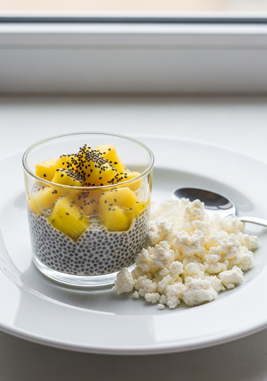 "Pineapple Chia with Cottage Cheese, featuring just four simple ingredients, is a convenient and protein-packed vegetarian option for breakfast or a quick snack."