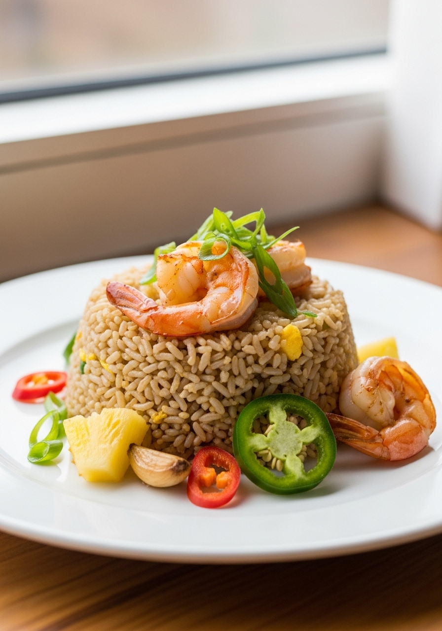 The delightful Pineapple Shrimp Fried Rice offers a perfect blend of savory, sweet, and spicy flavors. For an eye-catching presentation, serve it in scooped-out pineapples!