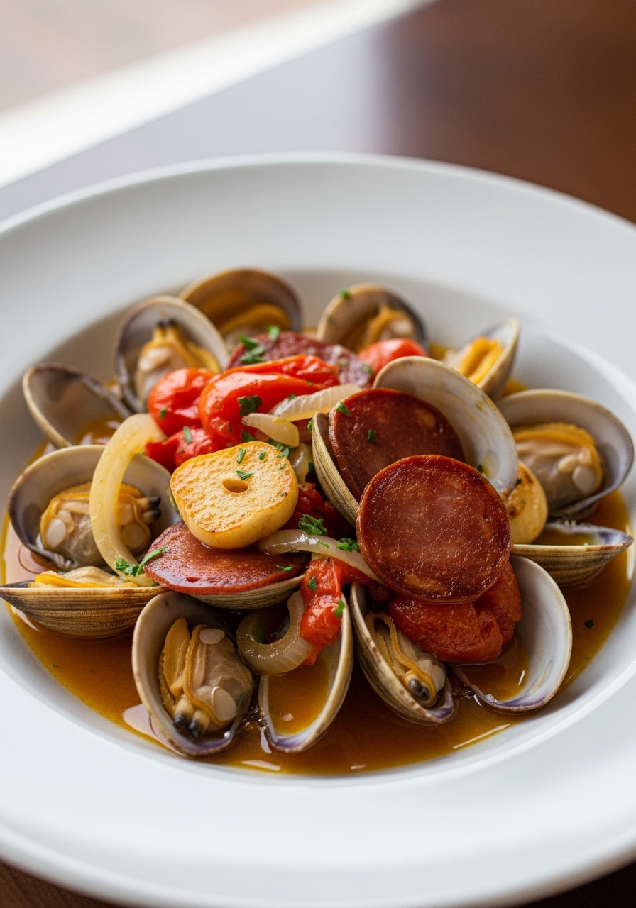 Experience the vibrant flavors of a Portuguese Seafood Stew, featuring a delightful medley of clams, shrimp, scallops, and chorizo. This hearty dish is a breeze to prepare, coming together in just minutes!