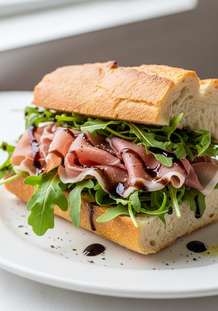 Indulge in the delightful fusion of flavorful prosciutto di Parma, zesty arugula, rich balsamic glaze, and nutritious olive oil, all nestled between slices of crusty French bread. This sandwich is a perfect blend of tastes that never disappoints.