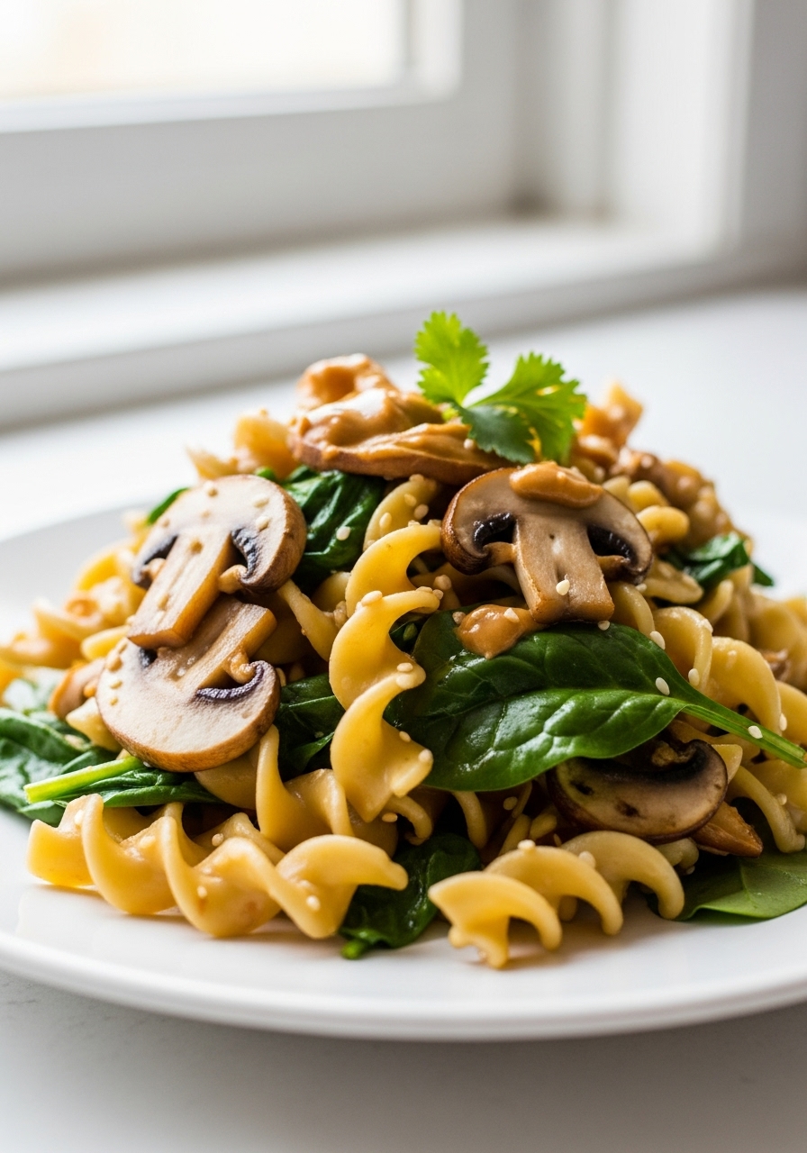 Whip up this simple, vegetarian Palmini Noodle Stir Fry for one, featuring a zesty peanut sauce, fresh spinach, and a delicious egg. Ready in just under 15 minutes, it's a delightful and flavorful dish!