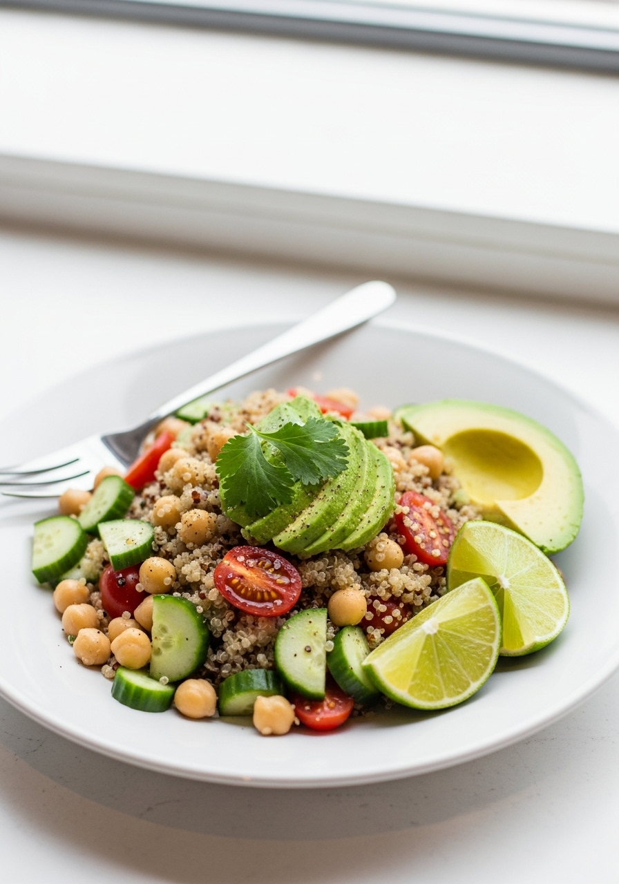 Introducing a vibrant salad featuring quinoa, chickpeas, and creamy avocado, accompanied by crisp cucumbers, juicy tomatoes, and zesty red onion. Finished with a splash of lime juice and a sprinkle of fresh cilantro, this delightful vegetarian dish is packed with protein, fiber, and nutritious fats, making it both satisfying and wholesome.