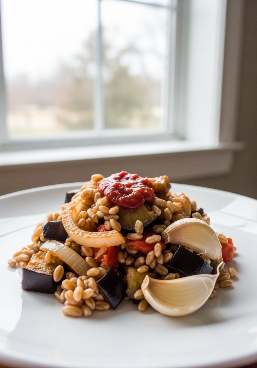 "Ratatouille with Farro is brimming with vibrant summer produce, including juicy tomatoes, tender zucchini, sweet bell peppers, and hearty eggplant. This dish can be savored as a delightful vegetarian entrée or served alongside your favorite protein as a flavorful side."
