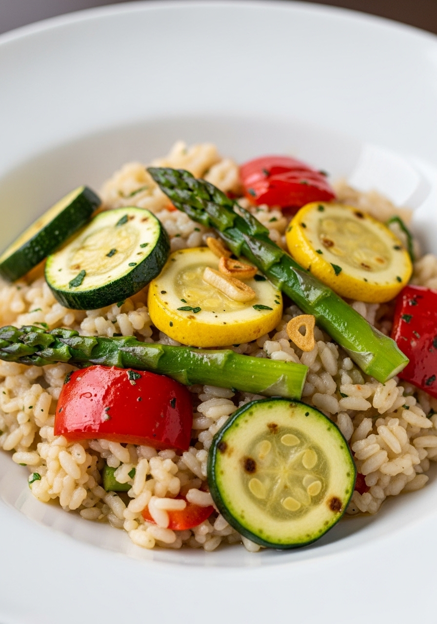 This Risotto Primavera dish beautifully captures the essence of spring, brimming with vibrant asparagus, sweet peas, tender zucchini, and juicy cherry tomatoes all in one delightful bowl.