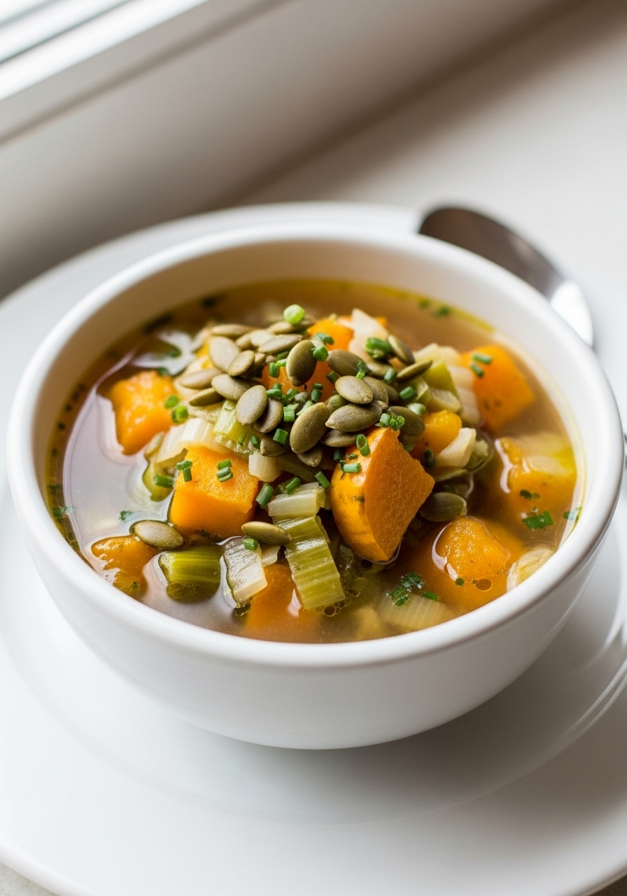 Pour in about two-thirds of the chicken stock into the pot; mix well and let it simmer for about 5 minutes. Using an immersion blender or a standard blender, blend the soup until it reaches a smooth consistency. Stir in the remaining broth and let it simmer for a few additional minutes. Season with salt and pepper to your preference. Top with pepitas and finely chopped chives for garnish.