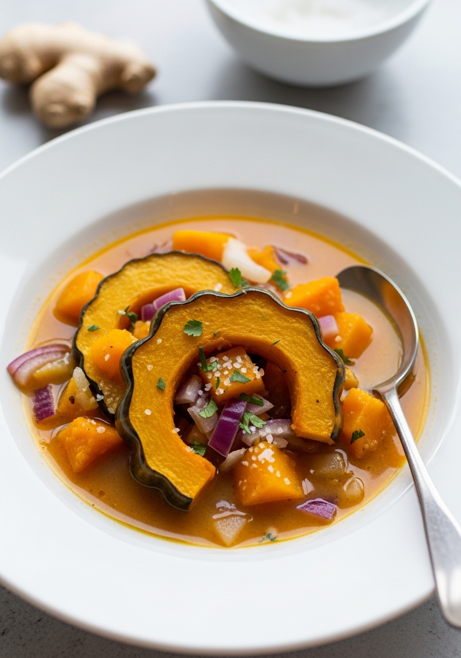 Once the roasting is complete, scoop out the flesh of the squash and add both the squash and onions to the pot, followed by the ginger, turmeric, and cayenne pepper.