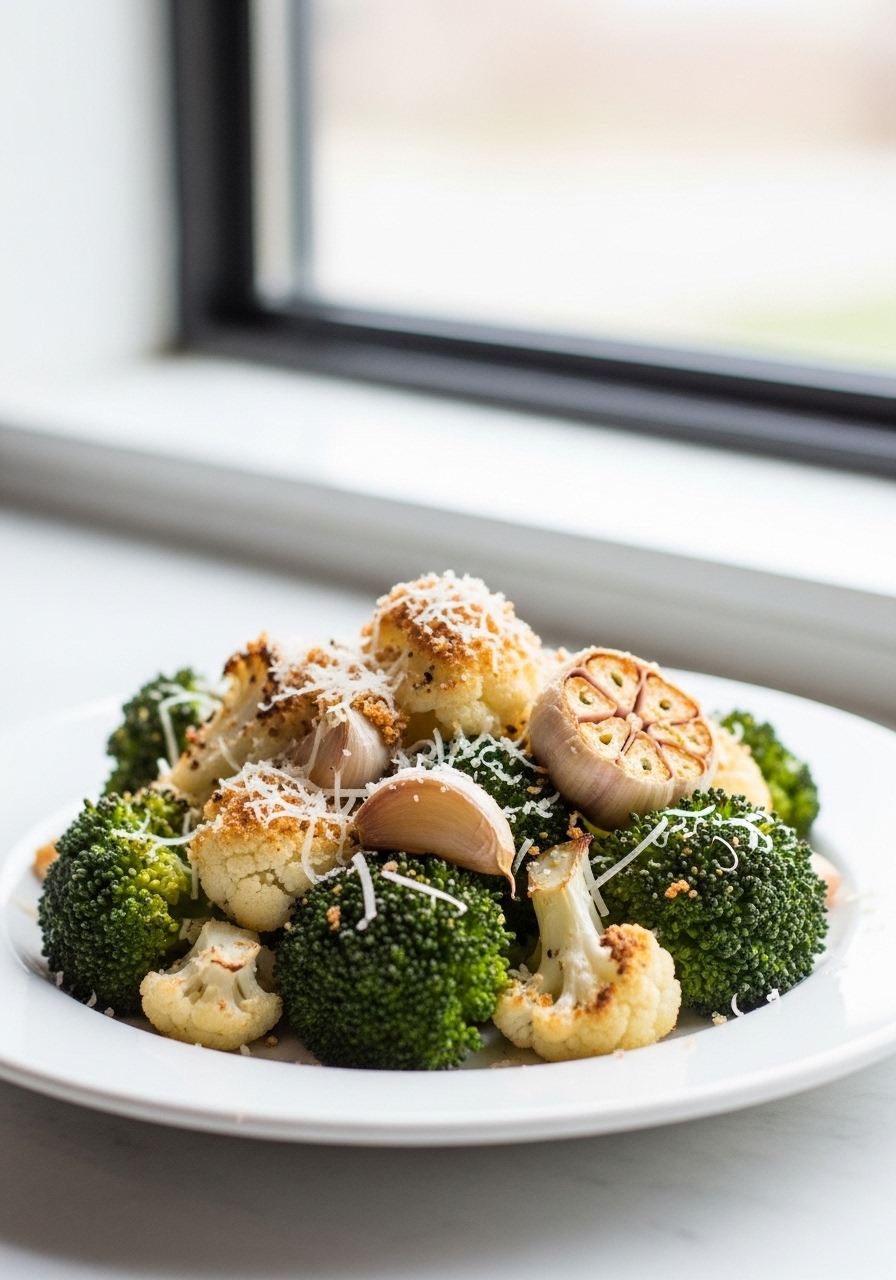 In a mixing bowl, combine the broccoli and cauliflower florets. Drizzle them with olive oil and add minced garlic, salt, black pepper, breadcrumbs, and half of the grated parmesan cheese. Toss everything together thoroughly to ensure even coverage.