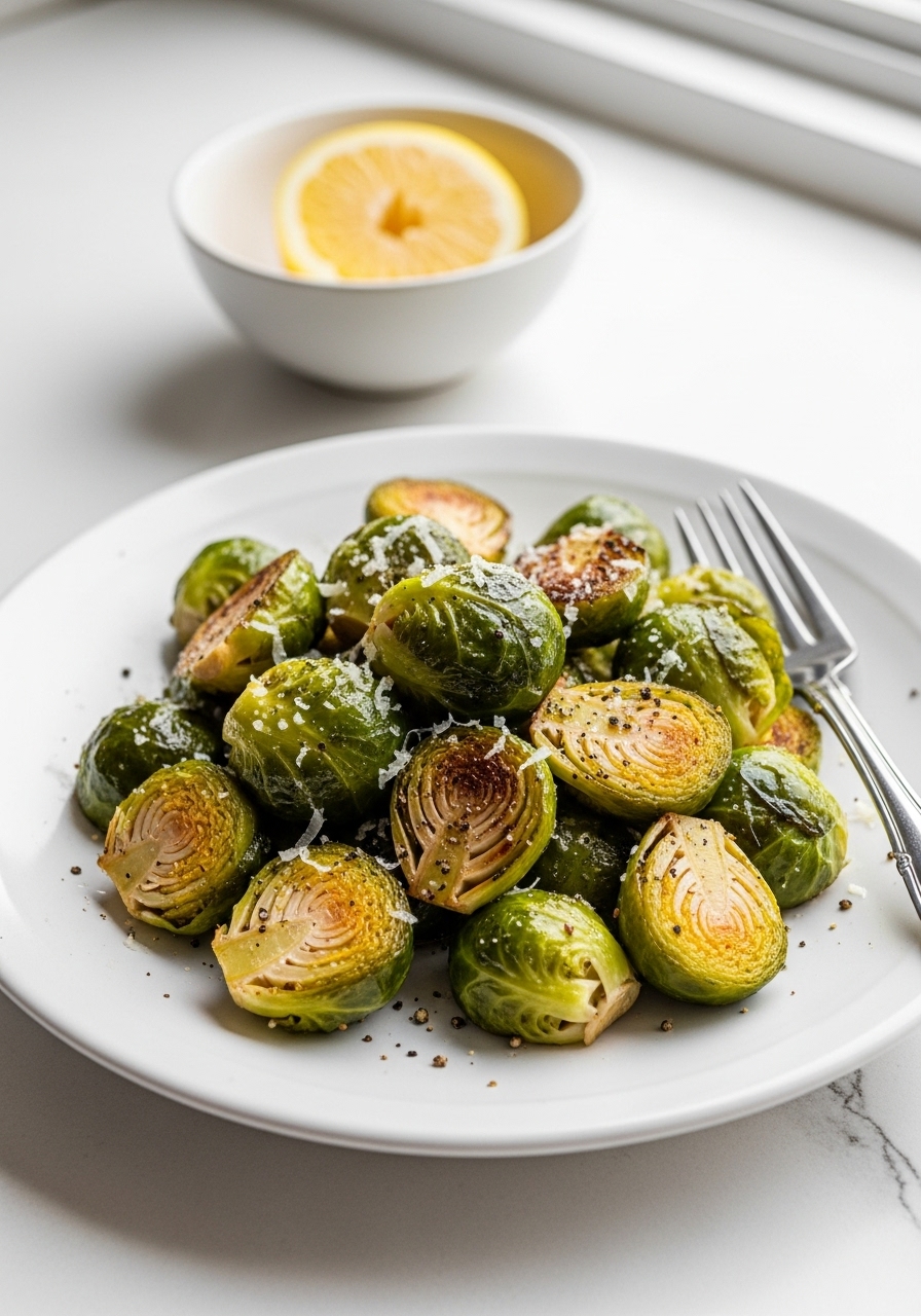 For an extra burst of flavor, return the hot roasted Brussels sprouts to the mixing bowl. Add lemon juice and either Parmesan or Romano cheese, then toss everything together until thoroughly mixed.