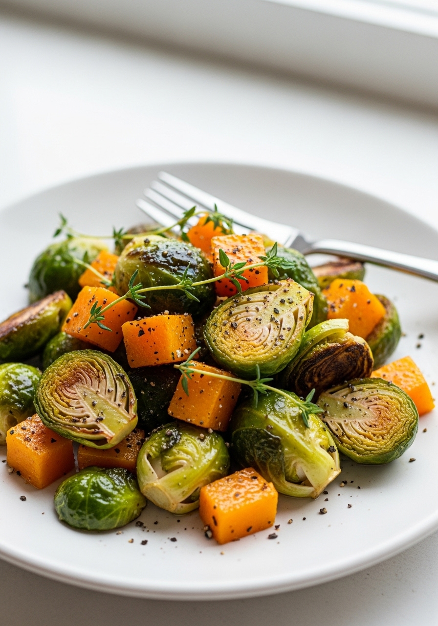 Indulge in the flavors of autumn with this delightful side dish featuring Roasted Brussels Sprouts and Butternut Squash. Drizzled with olive oil and seasoned with salt and pepper, these veggies are effortlessly prepared. Just spread them out on a baking sheet and roast until they are soft and the Brussels sprouts develop a lovely char around the edges. Enjoy a simple yet satisfying addition to your fall meals!