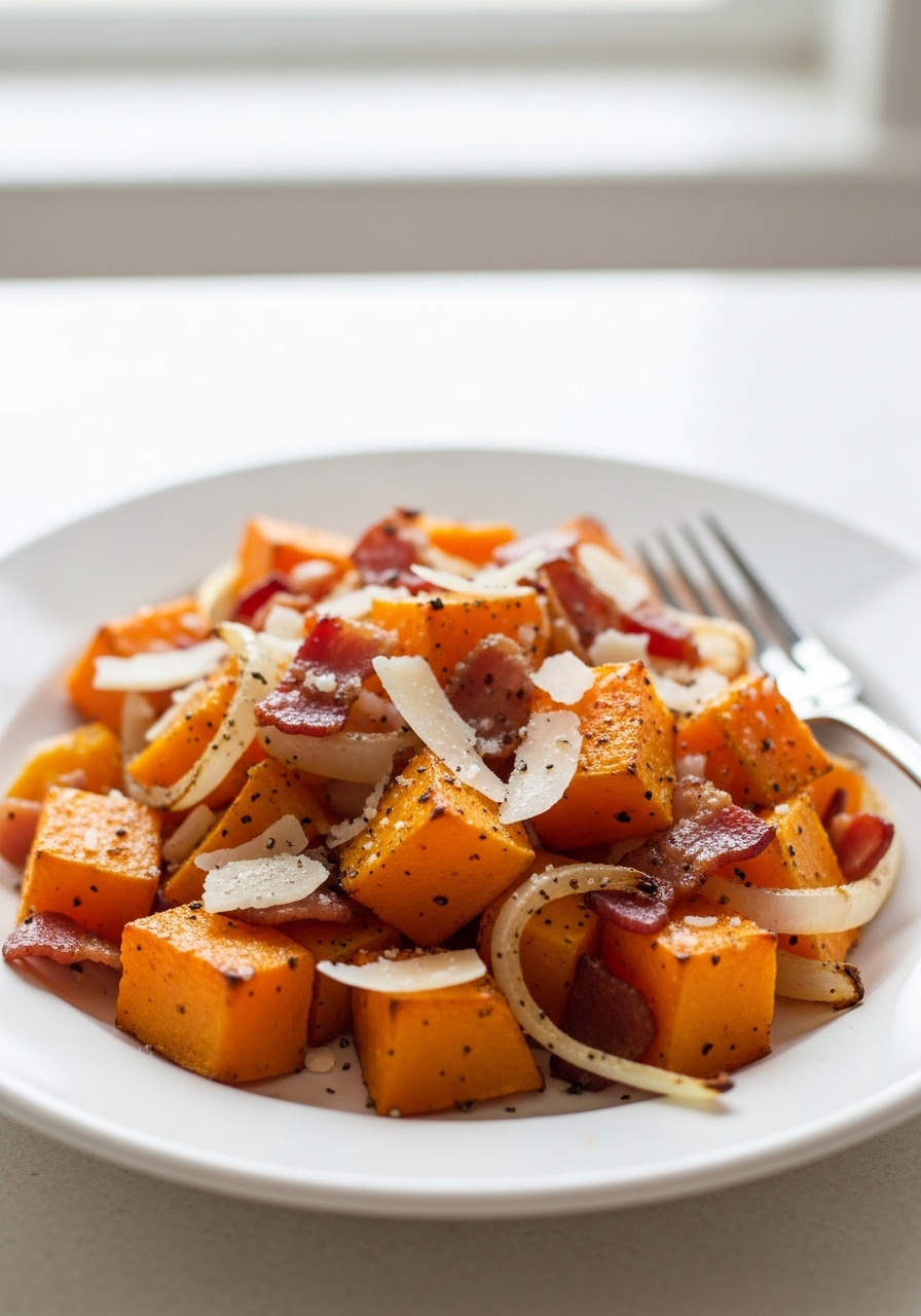 "Experience the delightful flavors of Roasted Butternut Squash combined with Sweet Onions, Crispy Bacon, and Savory Parmesan, all prepared effortlessly on a single sheet pan!"