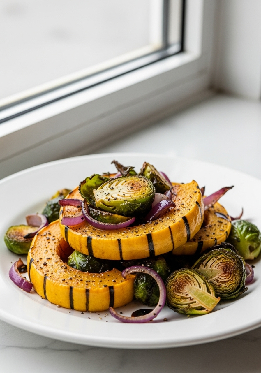 Roast in the oven for 25 to 30 minutes, or until both the squash and Brussels sprouts are golden and tender. Finish by drizzling with balsamic vinegar before serving.