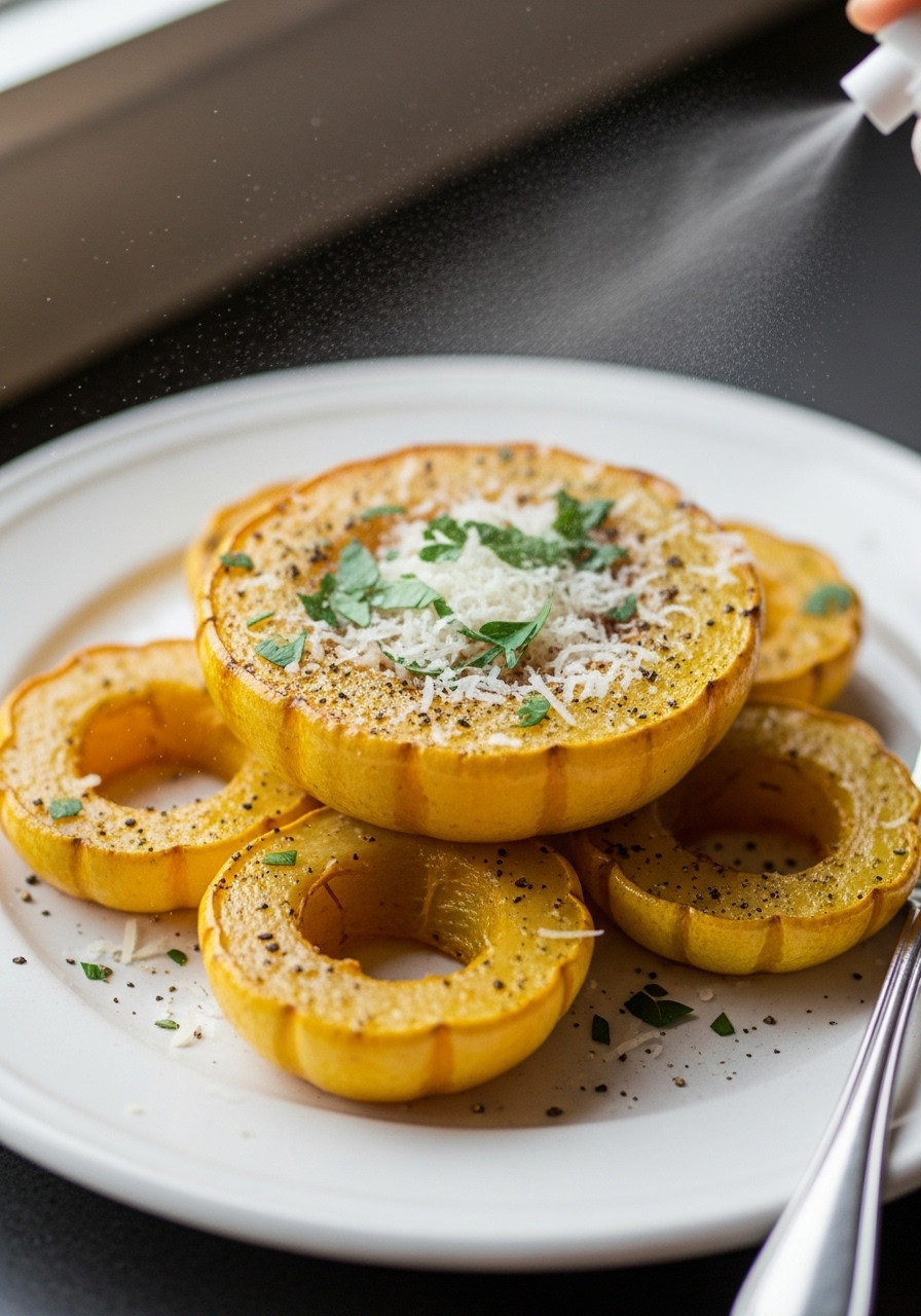 "Delicata squash, roasted to perfection and adorned with a delightful Parmesan and herb topping, is a favorite of mine. I prefer to keep it in the oven until the edges become wonderfully crispy, golden, and utterly delicious! If you don’t have Delicata on hand, feel free to substitute it with acorn squash for a similar effect."