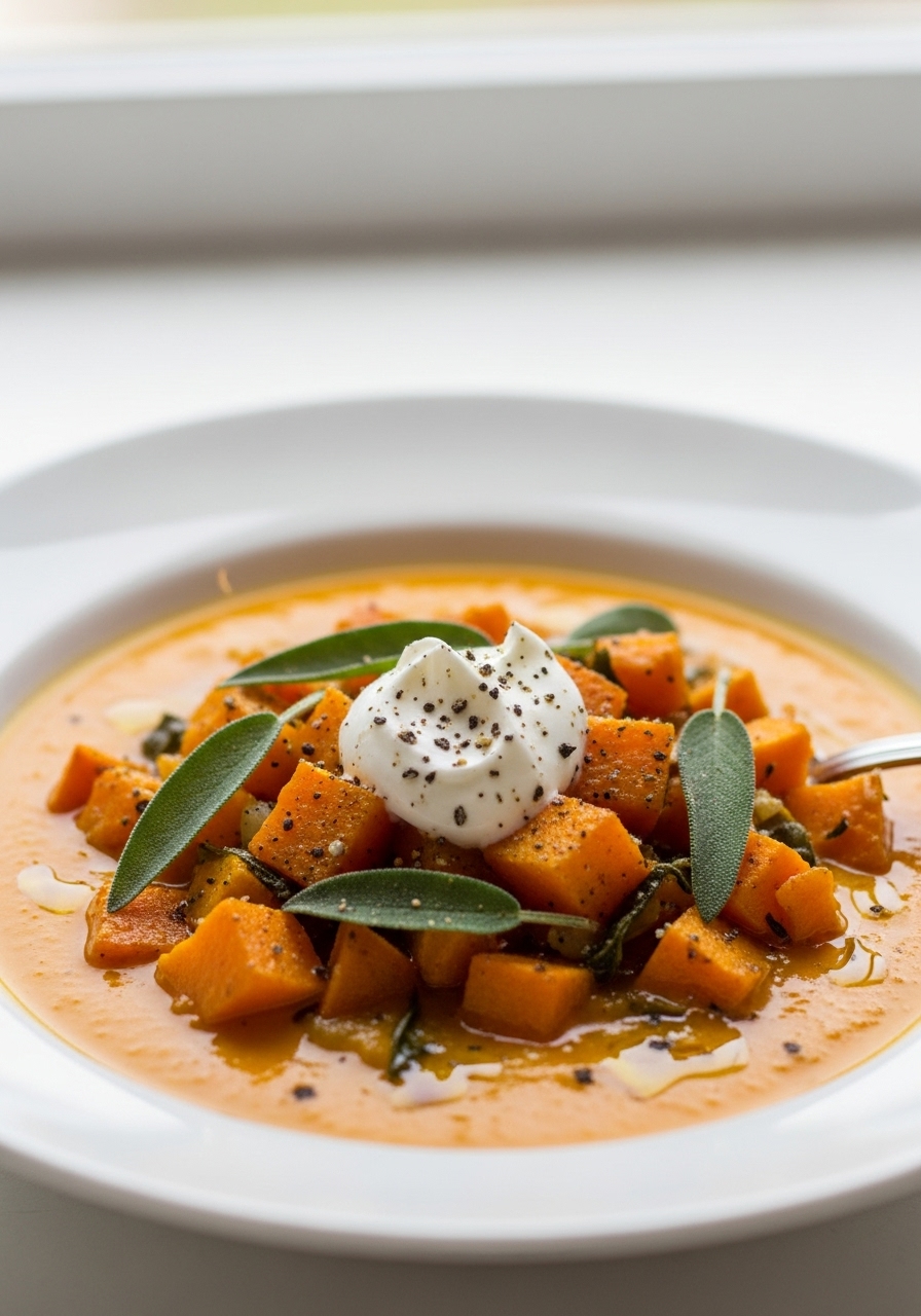 (Optional) Top the soup with a dollop of light sour cream or 0% Greek yogurt and a sprinkle of sage for garnish.