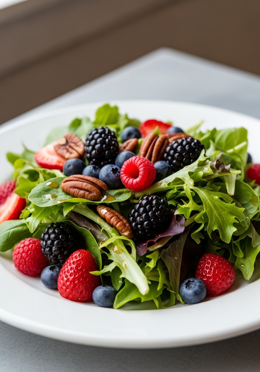 Garnish the salad with fresh blackberries, raspberries, and a sprinkle of pecans, and enjoy immediately.