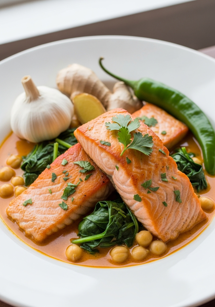"Quick and flavorful, this one-pot dish features perfectly seared salmon nestled among fresh spinach and hearty chickpeas, all enveloped in a rich coconut curry sauce. Best of all, it comes together in less than 20 minutes!"