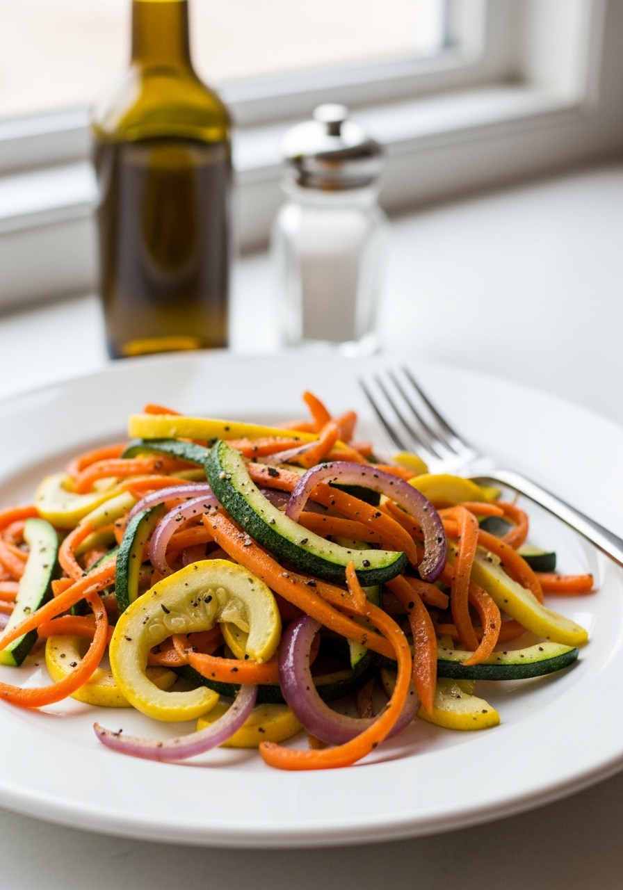 Fresh zucchini, vibrant yellow squash, and sweet carrots are transformed into spaghetti-like noodles and gently sautéed in fragrant garlic-infused oil. This delightful side is a staple for me throughout the summer months—not solely due to its low-carb, gluten-free, clean, and paleo-friendly attributes, but also because it's incredibly tasty, nutritious, and my husband's absolute favorite way to savor zucchini!