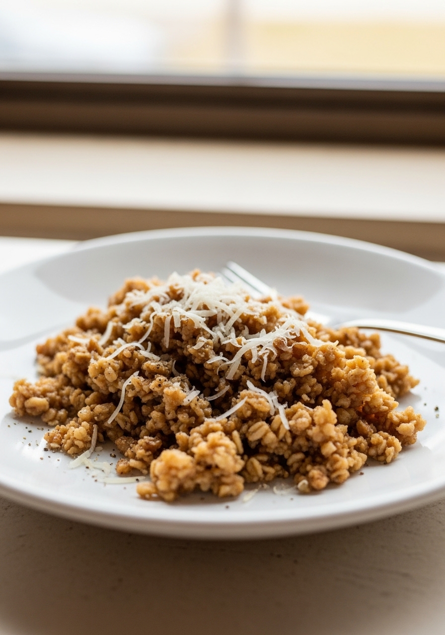 Spoon the cooked oats into a bowl, then add the remaining half teaspoon of butter, a pinch of salt, and 1 tablespoon of Parmesan cheese, stirring well to combine.