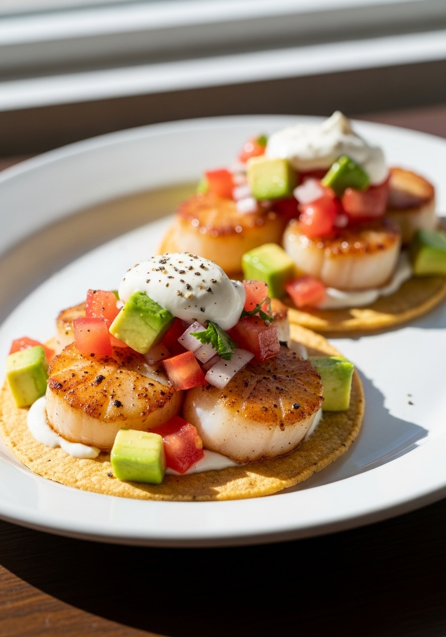 Spread a generous amount of guacamole over each tostada, arrange the scallops on top, and finish with a drizzle of sour cream.