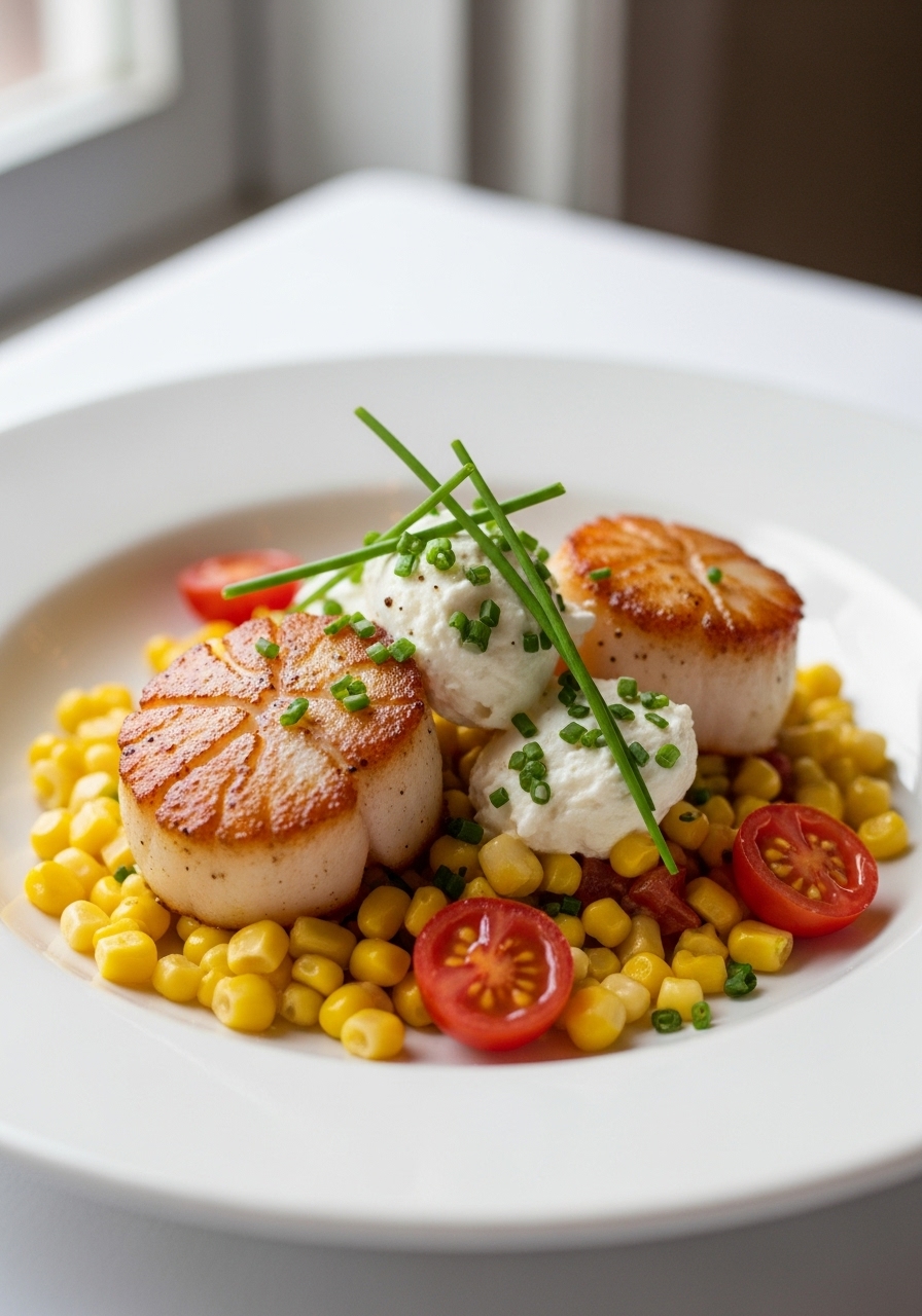 "Juicy scallops harmonize wonderfully with the sweetness of ripe summer corn and tomatoes, all brought together in a luscious creaminess from Boursin cheese."
