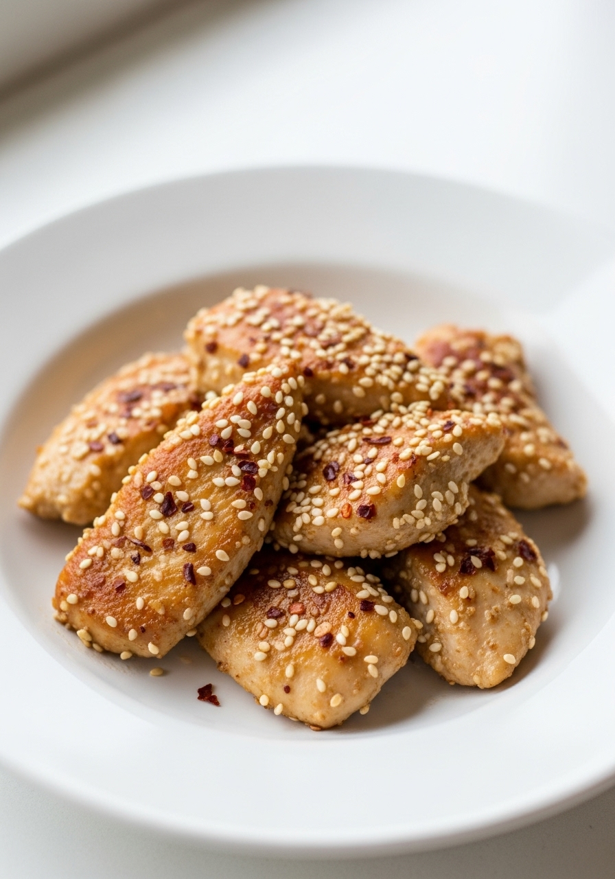 Serve the sesame chicken over a bed of cooked rice, garnishing with sesame seeds and chopped green onions for a fresh touch.