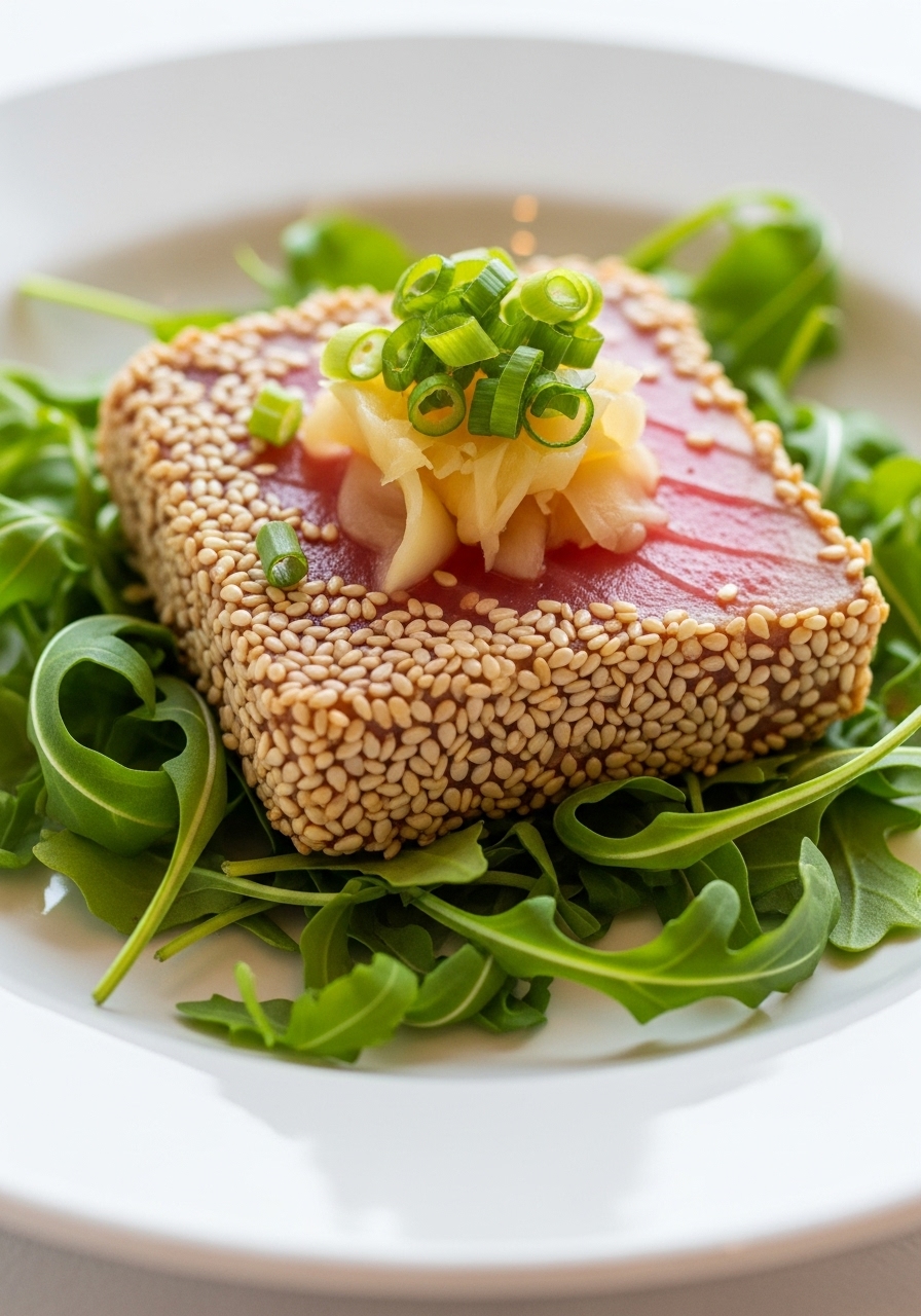 "Enjoy a delectable sushi-grade tuna steak coated in a crunchy layer of sesame seeds, drizzled with a zesty balsamic soy ginger vinaigrette—simply divine! This dish makes for a fantastic main course salad or a delightful appetizer."