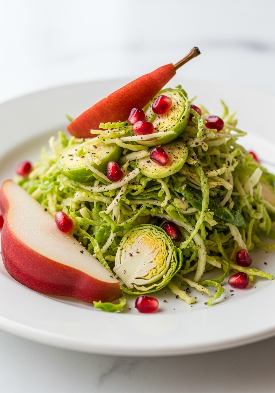 Indulge in this delightful Shaved Brussels Sprout Salad, featuring succulent pears, vibrant pomegranates, crunchy pepitas, and creamy goat cheese. It's the ideal accompaniment for your autumn meals.