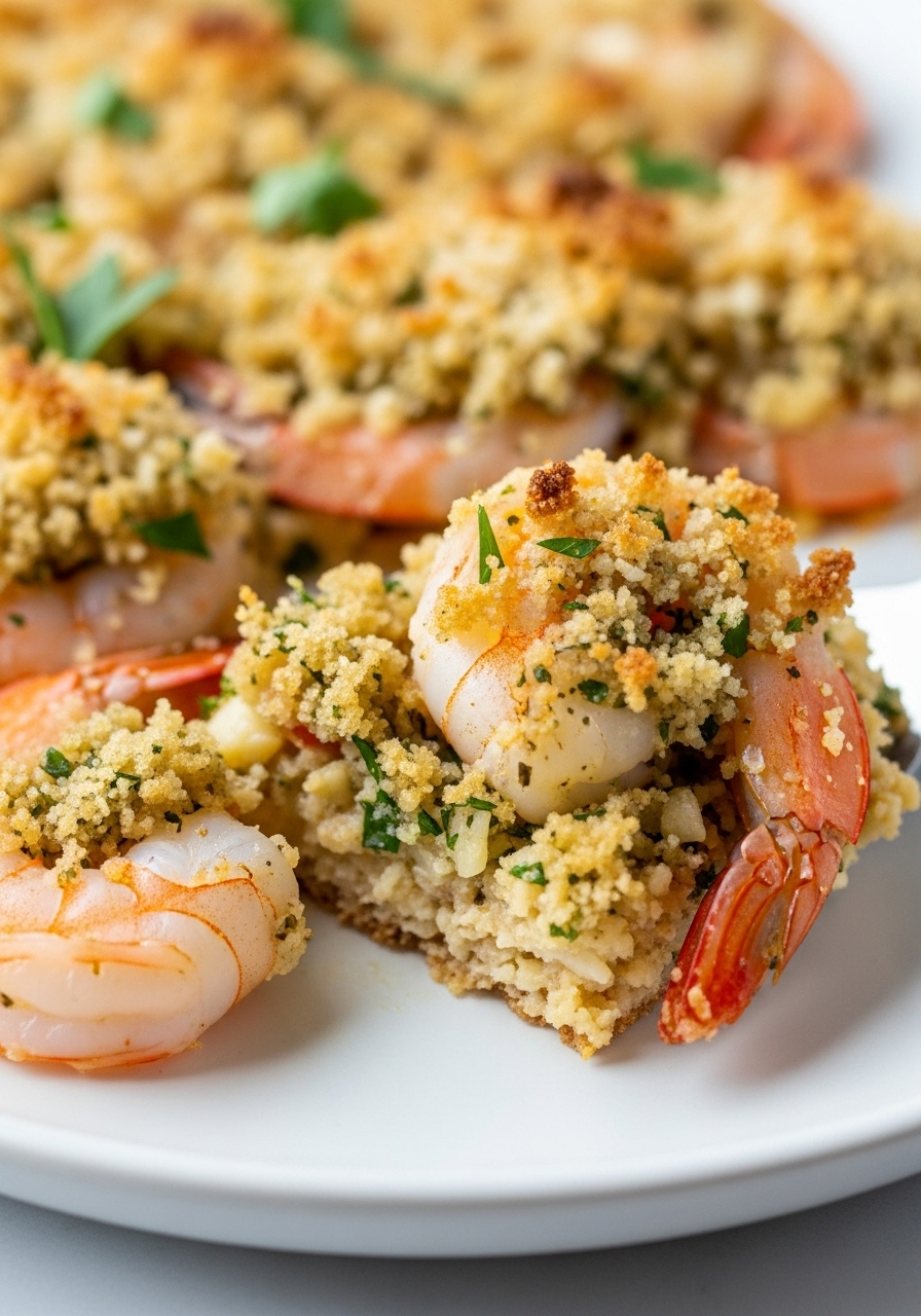 "Experience the delightful flavors of Sheet Pan Shrimp Oreganata, featuring plump jumbo shrimp generously coated with a delicate blend of breadcrumbs and Pecorino Romano cheese."