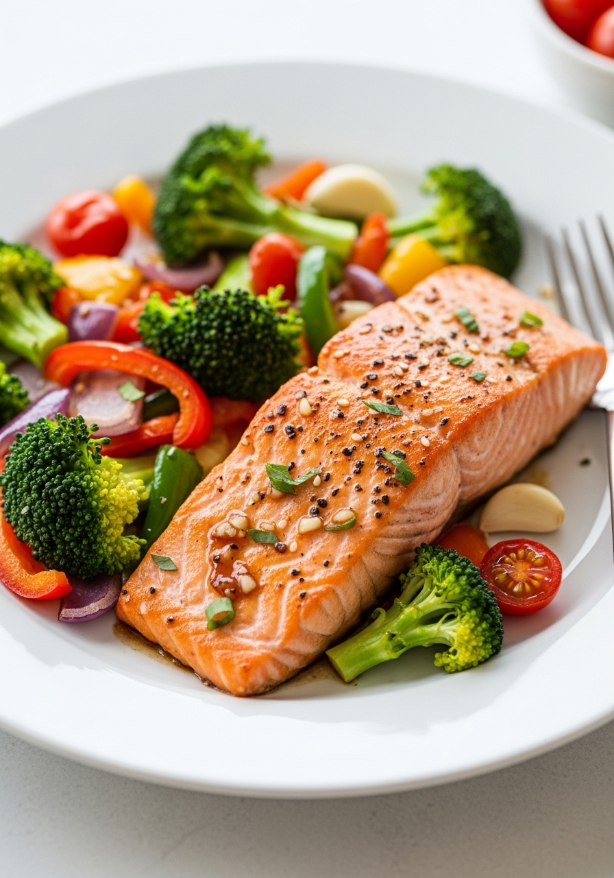 Once the salmon is done, brush the thickened sauce over the top of the fillets and sprinkle them with sesame seeds and chopped scallions. Serve the salmon alongside the roasted vegetables.