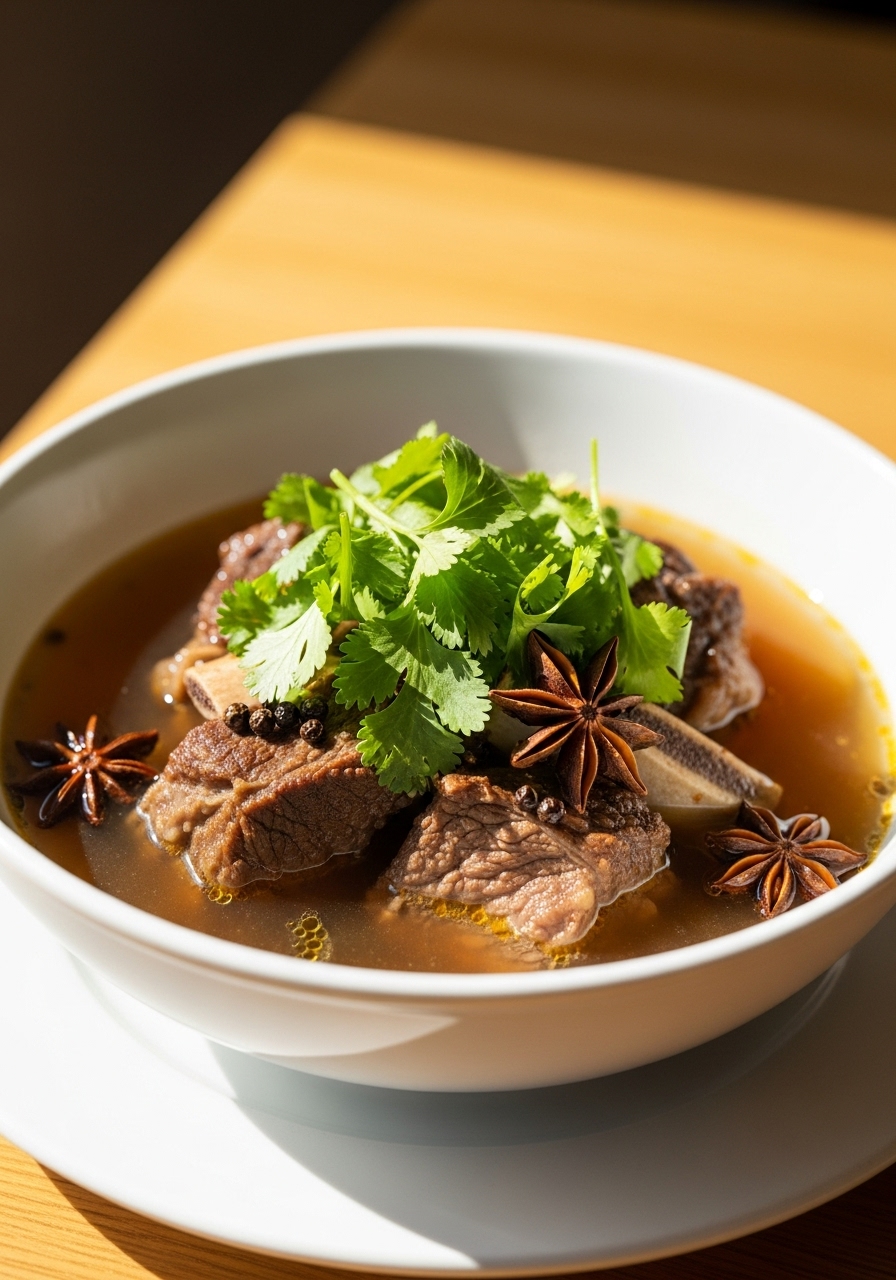 In a large pot or Dutch oven, combine the short ribs with the mushrooms, ginger, three whole scallions, cilantro stems, peppercorns, star anise, and beef broth.