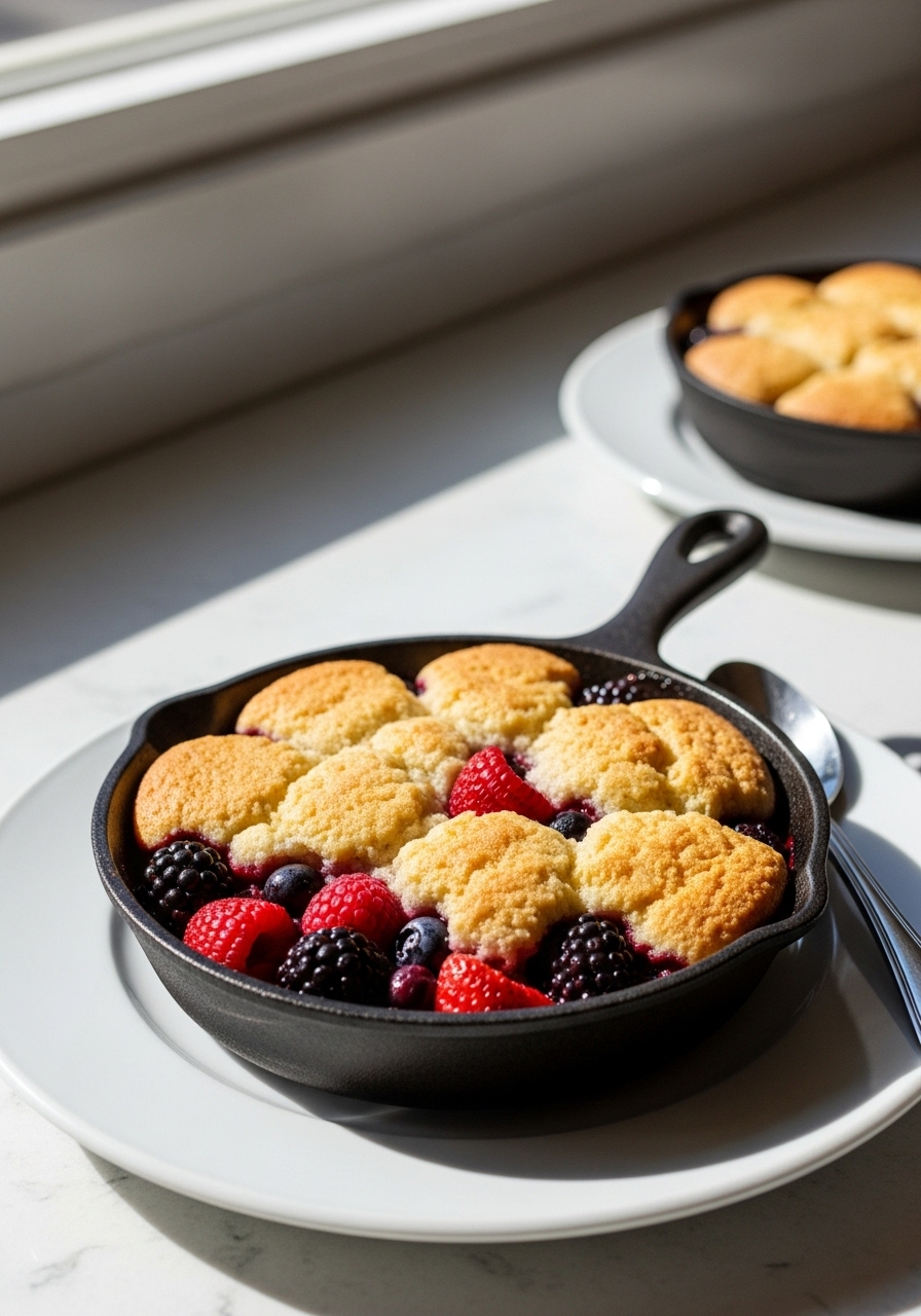 Introducing the Skillet Mixed Berry Buttermilk Cobbler, a delightful dessert featuring a medley of blackberries, raspberries, and strawberries. This sweet treat is topped with a mouthwatering biscuit crust and baked to perfection in a sturdy cast iron skillet. Enjoy the warm, fruity goodness straight from the pan!