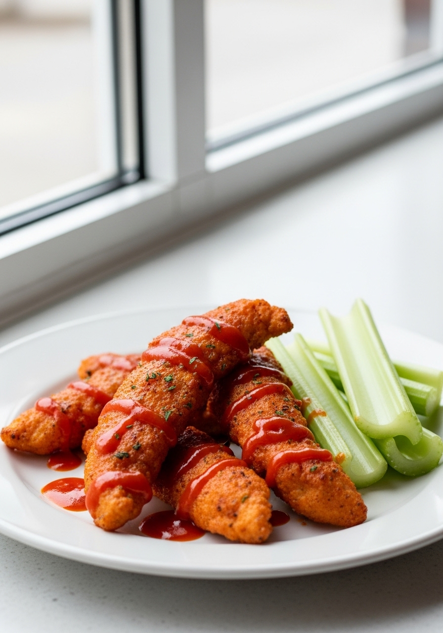 "Fast and simple – these buffalo chicken strips pack a flavorful punch! I love pairing them with my lightened-up blue cheese dip and crunchy celery sticks for a fiery and appetizing starter."