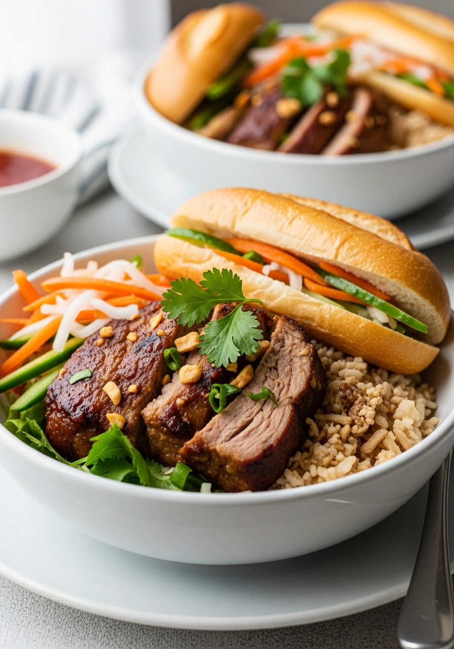 If you've savored the traditional Vietnamese Banh Mi sandwich, you're sure to enjoy this slow-cooked pork banh mi bowl, perfectly nestled atop a bed of brown rice!