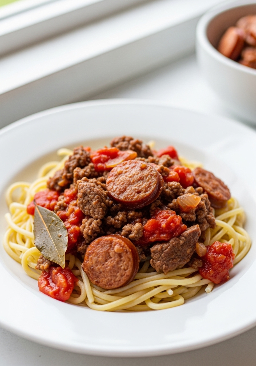 Once the meat sauce has finished cooking, remove the bay leaves and rind, then serve.