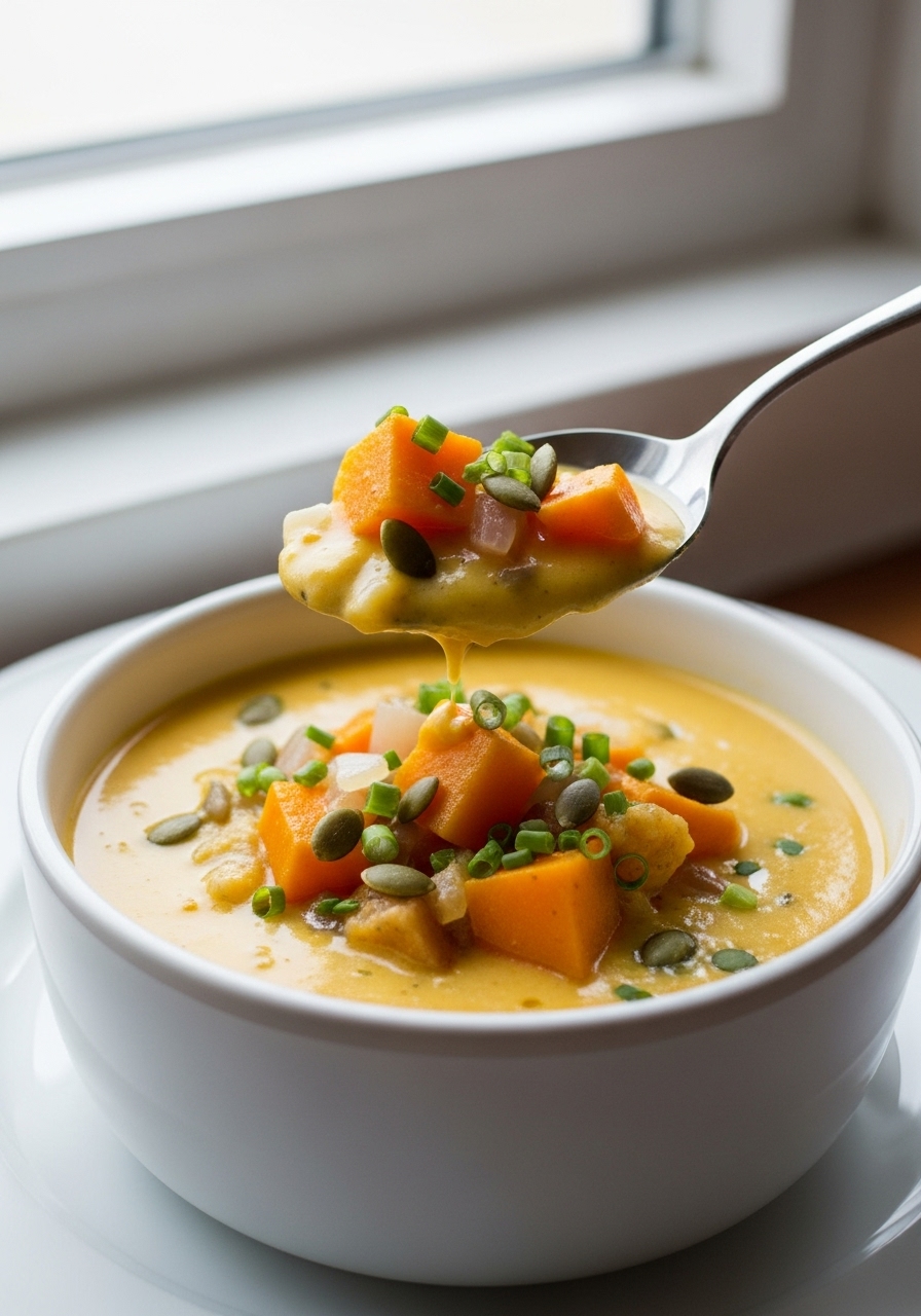 Adjust the seasoning with salt and pepper to your liking, and if you wish, top with extra coconut milk and chopped chives for garnish.
