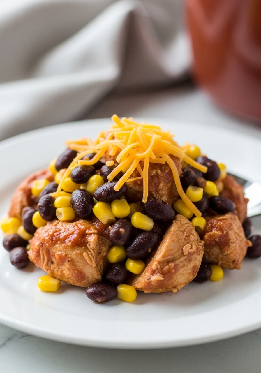 Indulge in this SIMPLE Slow Cooker Chicken creation that's both cheesy and mouthwatering. Featuring tender boneless chicken breast, black beans, sweet corn, and zesty salsa, all crowned with gooey melted cheddar cheese. Absolutely scrumptious!