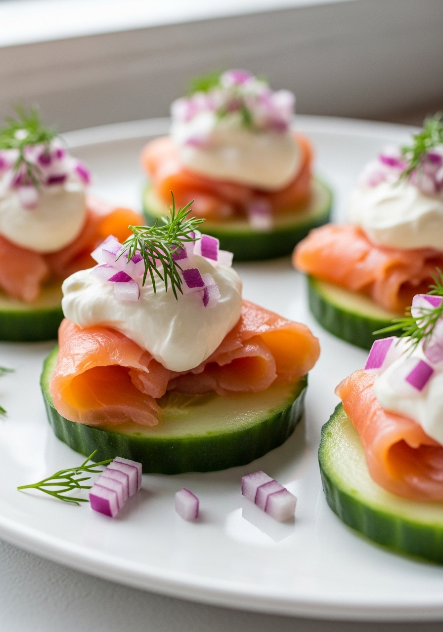 These delightful Smoked Salmon Cucumber Bites are an ideal low-carb starter for your festive gatherings. Each crunchy cucumber vessel is hollowed out and generously packed with a luscious blend of smoked salmon, creamy whipped cheese, zesty red onion, and briny capers—capturing all my favorite bagel toppings, but without the extra carbs!