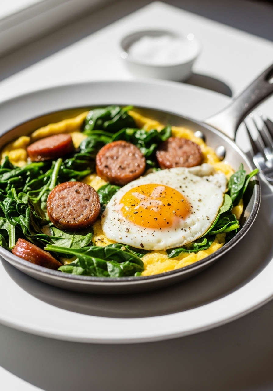 Indulge in a hearty breakfast with this Smoked Turkey Sausage Breakfast Skillet, where delectable eggs, fresh spinach, earthy mushrooms, and melted cheese blend harmoniously in a single pan. This dish is packed with protein, making it the perfect way to kick-start your day.