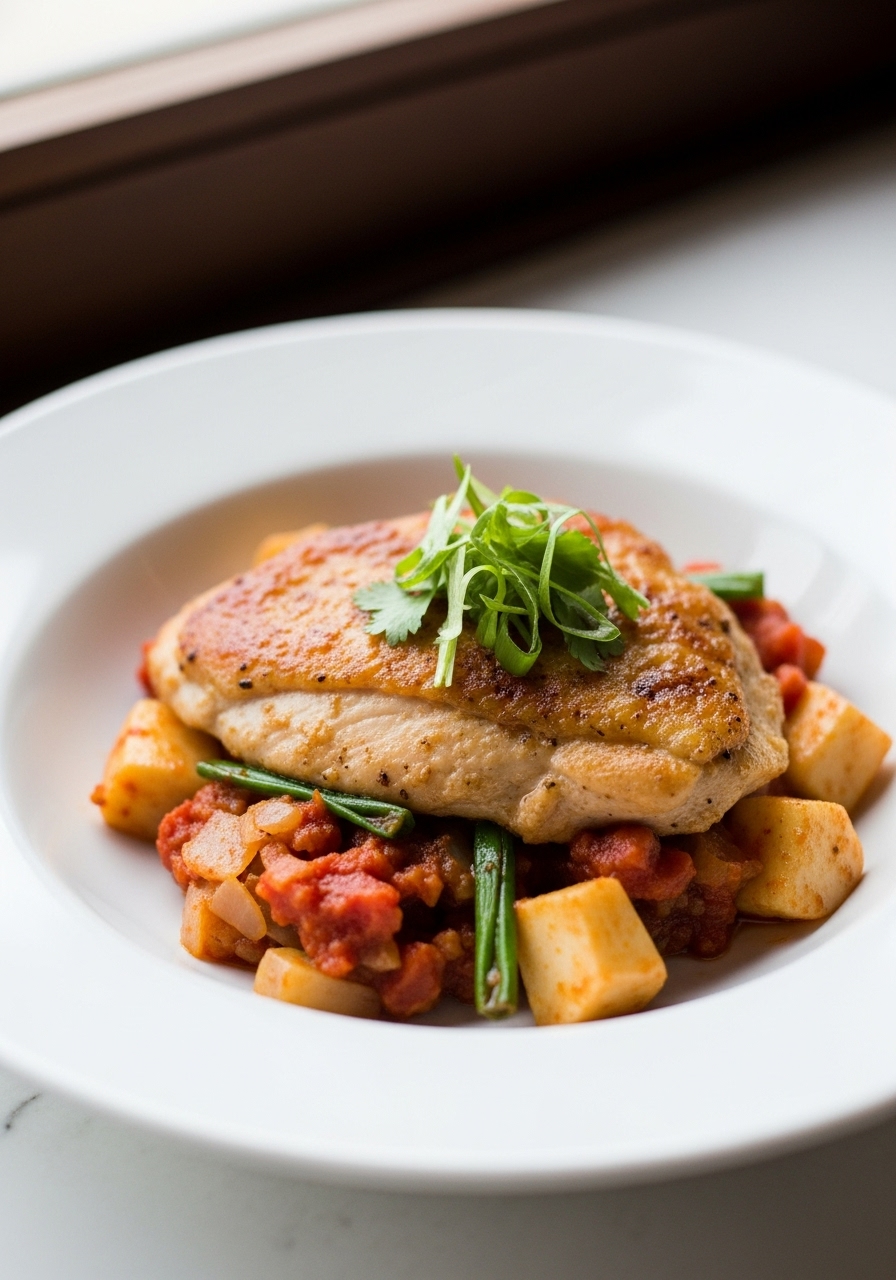 Cover the pan and let it simmer gently on low heat until the chicken is thoroughly cooked, approximately 20-30 minutes. Serve the stew over a bed of rice.