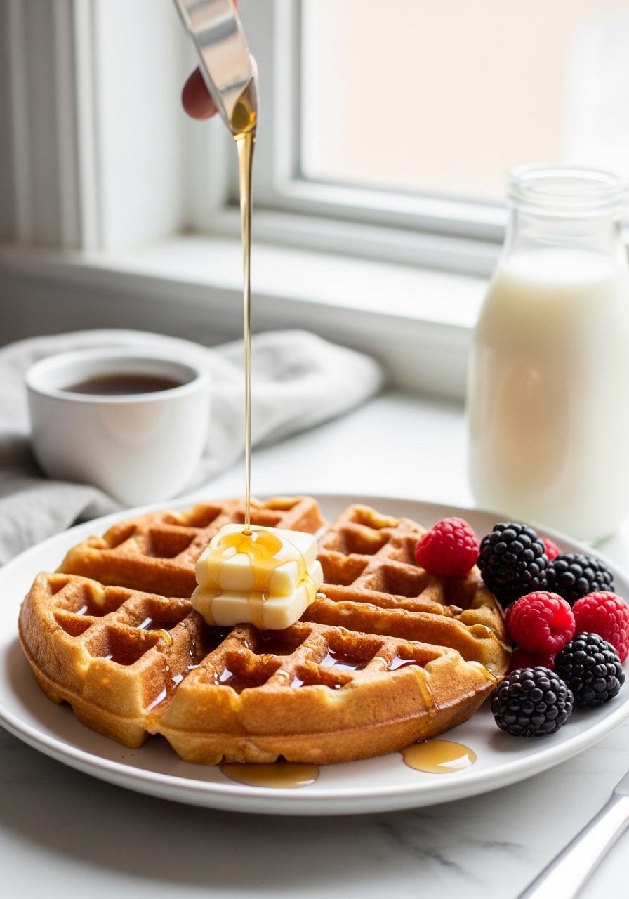 Enjoy the waffles warm, topped with your preferred accompaniments.