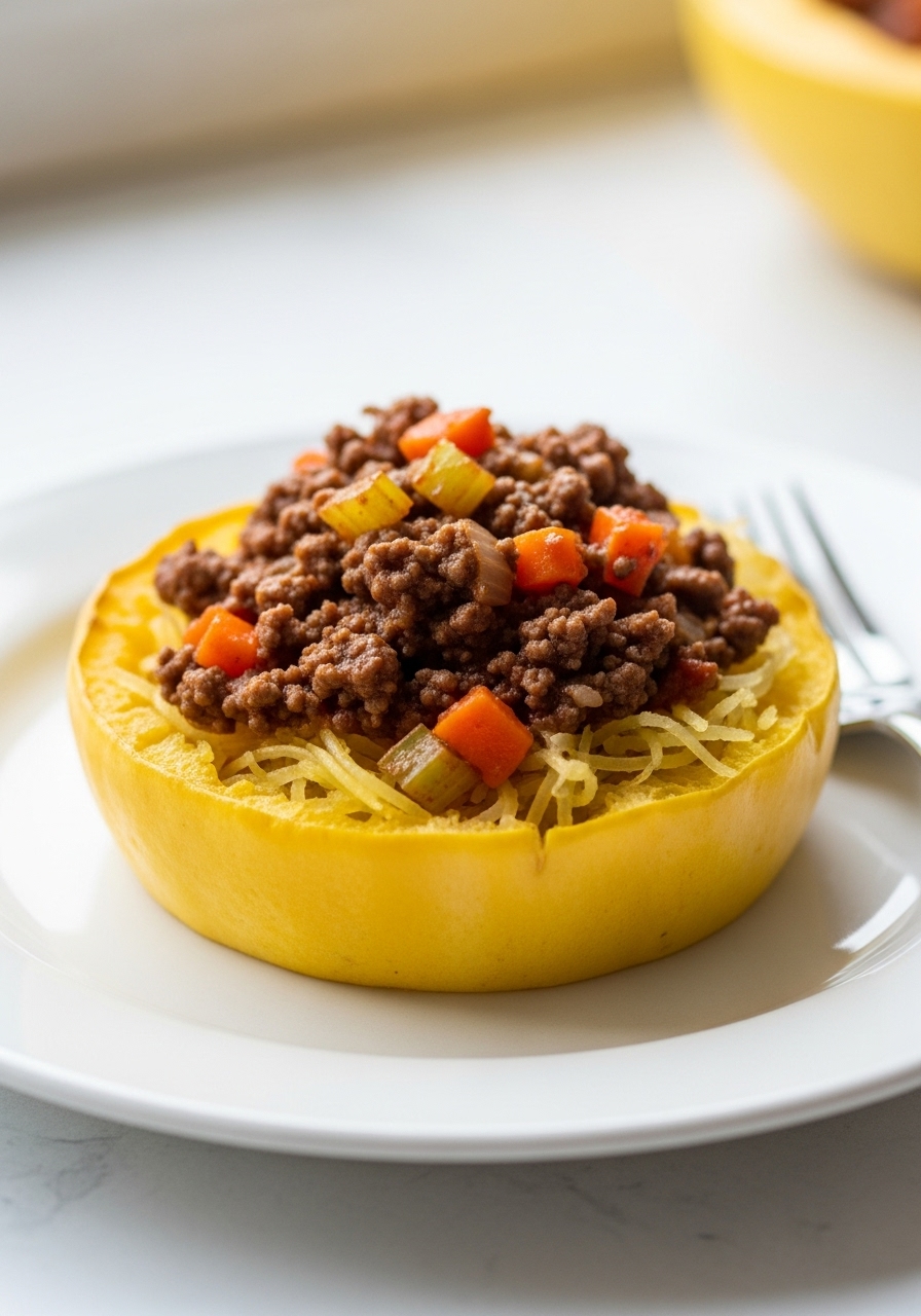 "Enjoy roasted spaghetti squash generously adorned with a flavorful meat ragu, slowly cooked with ripe tomatoes, onions, carrots, and celery. This low-carb delight is one of my favorites—you'll hardly notice the absence of traditional pasta!"