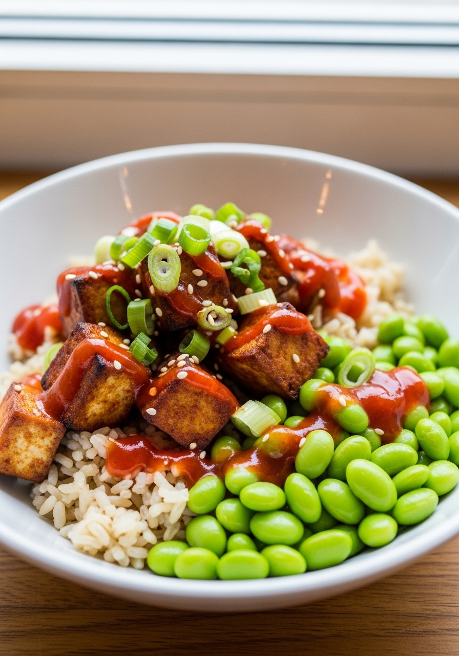 Once the tofu is done, toss it with the prepared sauce until it is thoroughly coated. Serve hot over rice, garnished with edamame, sesame seeds, and the green parts of the scallions.
