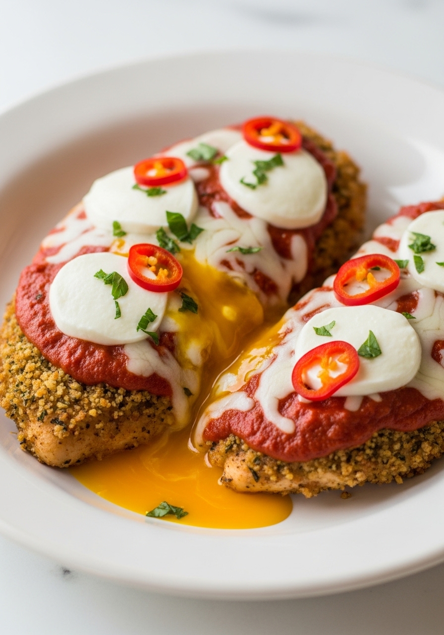 "Spicy Vodka Chicken Parmesan features tender breaded chicken cutlets topped with zesty vodka sauce, fresh mozzarella, and sliced hot cherry peppers from a jar. You can bake them in the oven or use an air fryer for a crispy finish!"