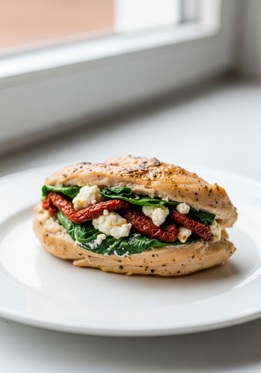 This delectable Spinach Tomato Feta Stuffed Chicken Breast showcases a savory filling of fresh spinach, tangy sun-dried tomatoes, and creamy feta cheese. After being seared to a golden finish in a skillet, the chicken is then baked until it reaches the ideal level of tenderness.
